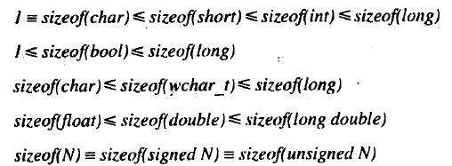 在32位计算机中测试得到: sizeof(bool) == 1 sizeof(char) == 1 sizeof(short) == 2 sizeof(int) == 4 sizeof(long) = 4 sizeof(float) == 4 sizeof(double) == 8